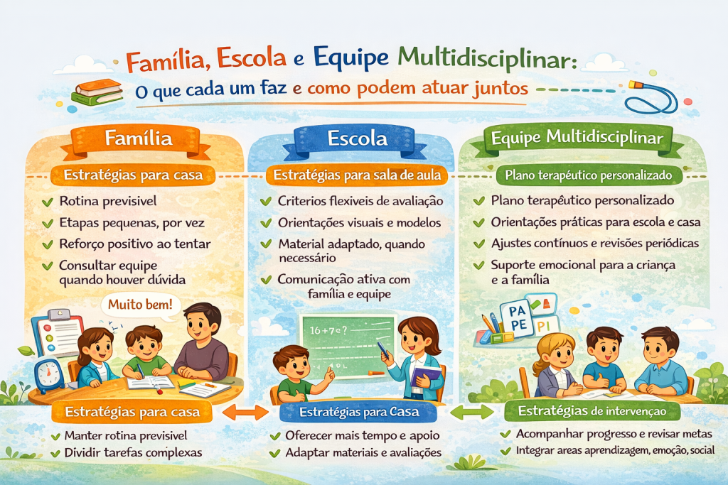 Rotina de tarefas com tempo definido, quantidade de exercícios ajustada, critérios claros para avaliação, combinados sobre recados, reuniões periódicas curtas, registro de estratégias que funcionaram, adaptação de materiais quando necessário, apoio escolar focado em autonomia.